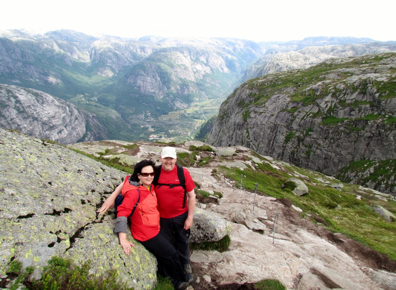 I crawled out on my hands and knees and sat. Can you read my sign above? Here's a better view. When I was getting ready to hike Preikenstolen in 2009, my dad told me I was not allowed to go. I figured I was old enough to do as I like so I made a sign and Ron took a picture of me with it. Mom showed it to him and she said it made him smile. He died the next year but Mom said whenever he saw it, he smiled. I love you, Dad! And yes, I was terrified.